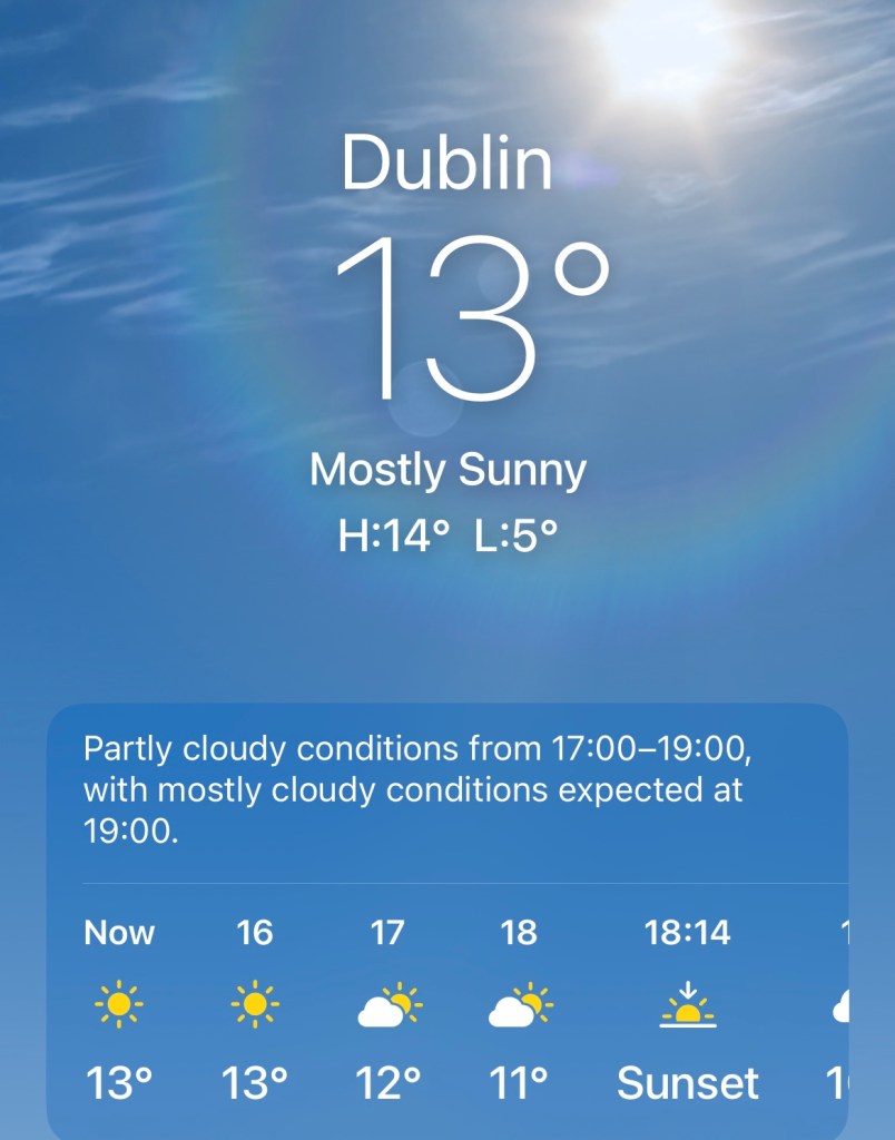 We are slowly moving North and the weather is forecast to stay good in Dublin.